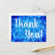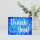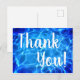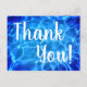 Photo d'eau de piscine bleu aqua avec un filtre lumineux. Texte "merci" en calligraphie blanche. Créez vos propres cartes de remerciement après votre événement spécial dans un lieu au bord de la piscine.