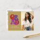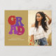 Cette carte de vœux de fin d'études amusante présente une interprétation moderne du design des années 1970. Le recto de la carte comprend des lettres des années 70 à gauche et une photo verticale à droite. La typographie rétro indique « Grad » dans des nuances de cerise, de prune, de mûre et de framboise sur un fond doré. Le nom du diplômé et de l'école sont écrits sous la typographie, et l'année de fin d'études est écrite sur le D dans « Grad ». Au verso, vous pouvez ajouter un message aux destinataires et/ou des informations sur la fête de fin d'études.