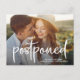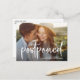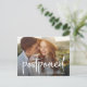 Carte postale Mariage moderne de remise de Faire-part. Design caractéristiques calligraphie script superposition en blanc ''reporté'', votre photo et les détails sur le dos.