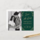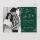 Annoncez votre date de mariage dans le style avec notre élégante enregistrer la date carte postale. Avec son design Art Déco en or et en calligraphie sur un arrière - plan vert, cette carte attire immédiatement l'attention et apporte une touche de sophistication à votre faire-part. Customisez-le avec une photo de vous et de votre autre significatif pour une touche plus personnelle. Commandez maintenant pour donner le ton à votre mariage de rêve.