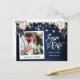 Script De Brosse Moderne, Style Caméra Instant, Couple Photo Enregistrer La Date Photo Fiançailles Carte Postale - Rustic Country Blue Wood, String Lights. Comprend la aquarelle bleu rose floral avec rose et la végétation botanique.