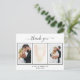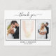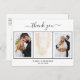 Une carte postale élégante et simple en Merci mariage de la mariée et du marié, personnalisée avec votre propre photo. Ajoutez 3 de Vos photos mariages, taille verticale, date du mariage, vos noms et la note de remerciement. Un arrière - plan blanc chic avec du texte noir et un cadre blanc. Le texte : Merci sur l'avant et vos noms sur l'arrière sont écrits avec une écriture manuscrite stylisée.