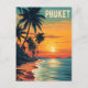 Ce beau poster vintage présente l'allure tropicale de Phuket au coucher du soleil. Des palmiers silhoués s'étendent sur une plage dorée, le ciel brille dans des tons chauds et rétro d'orange et de rose. La texture nostalgique et la palette de couleurs vintages capturent l'essence d'un paisible paradis thaïlandais, parfait pour évoquer l'esprit du voyage du milieu du siècle et la détente exotique.