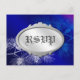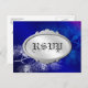 Cartes postales RSVP modifiables avec des lettres de script élégantes et l'art vintage d'une toux de pin en cônes de pin bleu et blanc à l'intérieur d'un cadre argenté sur un arrière - plan bleu. Cliquez sur Customiser pour ajouter votre nom ou votre message, même enregistrer votre conception pour plus tard.