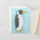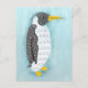 Un mignon pingouin avec une bordure fantaisiste et des points roses regarde, sur un fond bleu glacé.