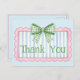 This cute thank you postcard features a pink frame with blue and white stripes and topped with a preppy green and white gingham plaid bow. Personalize with your choice of special text.