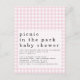 Pique-nique dans Park Baby shower Rose En vichy Invitation sur une carte postale pratique. L'en-tête d'occasion est grand en minuscule élégant avec les détails en bas sur une couche d'opacité superposée sur l'arrière - plan en vichy. Personnalisez facilement le texte à vos propres détails.