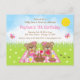 Cette invitation d'anniversaire mignonne et fantaisiste présente des ours adorables faisant un pique-nique sur une nappe rose à carreaux avec des friandises telles que du miel, de la pastèque, de la confiture de fraise, de la limonade et de la tarte. En arrière-plan, on voit un ciel bleu vif et un soleil radieux, des papillons et des marguerites. Le texte combine des polices décoratives et serif pour un look élégant et moderne. C'est parfait pour une fête d'anniversaire de printemps ou d'été.