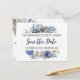 Cette belle carte de Save the Date est la première que vos invités de mariage verront de votre mariage à venir. Ce design de roses aquarelles, de pivoines et de pampas en bleu et ivoire crée une déclaration élégante pour vos futurs invités de mariage.