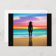 L'océan est un turquoise vibrant, et le sable mouillé reflète la silhouette et les couleurs du ciel.