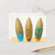 Parlez à vos amis de vos fantastiques vacances à la plage avec cette carte postale de surf! Un design composé de trois planches de surf en bois rétro installées les unes à côté des autres sur le sable. Les motifs de la planche de surf comprennent des vagues bleues, des dauphins et des palmiers. Ce design est cool, branché et parfait pour les amateurs de plage, d'été et de surf.
