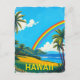 Cette image est une illustration vivante d'une scène tropicale à Hawaï. Il présente un ciel bleu vif avec des nuages blancs et un arc-en-ciel coloré qui vole à travers le ciel. Au premier plan, des palmiers verdoyants et des plantes tropicaux. L'arrière - plan offre une vue pittoresque sur les montagnes et l'océan, avec des vagues douces qui font le tour du rivage. Le mot "HAWAII" est affiché en haut en bas en lettres jaunes en gras. L'ensemble rappelle un poster de voyage d'époque.
