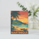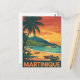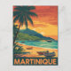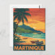 Cette superbe affiche de style vintage capture la beauté tranquille d'une plage en Martinique. Elle présente une scène de coucher de soleil serein avec des palmiers, des bateaux amarrés dans les douces vagues et un paysage montagneux luxuriant à l'arrière-plan. Les couleurs riches et chaudes ainsi que la typographie classique lui donnent la nostalgie d'une publicité de voyage rétro, ce qui en fait une pièce parfaite pour quiconque aime les escapades tropicales et l'art vintage.