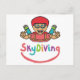 Un design amusant de Skydiving montre un skydiver avec casque, lunettes, pouces vers le haut et les jambes projetées derrière. En tombant dans l'air, en attendant le bon moment pour déployer le parachute. Le mot "Skydiving" sous le "g" se transforme en un grand sourire.