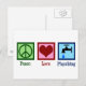 Cartes postales de plomberie mignonne Peace Love pour un plombier qui comporte un signe de paix cool, un coeur et un robinet d'eau qui coule.