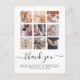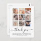 Une belle carte de remerciement pour la naissance de votre bébé avec une grille de photos carrées dans un style moderne, parfaite pour présenter votre petit bout de chou à votre famille et vos amis et les remercier pour leur soutien pendant votre grossesse ! Le design moderne présente un collage de 9 photos carrées personnalisables. En dessous, il y a un en-tête "merci" dans un script chic et fantaisiste et le nom et les informations de votre bébé, en lettrage simple. Au verso se trouve votre message personnalisable. Grâce au bouton "personnalisation", vous pouvez remplacer les photos et modifier le texte.