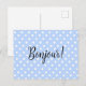 Pois blancs sur carte postale bleu clair avec le mot BONJOUR épelé dans des lettres de typographie sophistiquées. Français pour Hello.