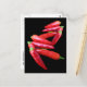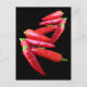 This Post-card, brillant scarlet red hot chili peppers on a pure black background.
