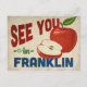 Une charmante carte postale de voyage vintage de Franklin Tennessee avec une jolie pomme rouge, ainsi qu'un texte amusant de style rétro qui dit "À bientôt à Franklin"