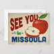 Une charmante carte postale de voyage vintage de Missoula Montana avec une belle pomme rouge, ainsi qu'un texte de style rétro amusant qui dit "À bientôt à Missoula"