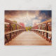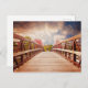 Carte postale avec un pont en bois à l'aspect pittoresque qui mène à un chemin entouré d'arbres forestiers qui changent de couleur.