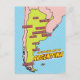 Cette carte illustrée de l'Argentine est rendue dans un style pop art vibrant. La carte est délimitée en noir et remplie d'une couleur jaune vif, sur fond bleu avec un motif à points. Les principales villes d'Argentine sont étiquetées dans des boîtes bleues.