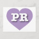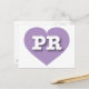 Cette carte postale présente un coeur de lavande contenant les lettres coques en haut, blanches et audacieuses PR, l'abréviation officielle de Porto Rico, l'île de l'enchantement. Le verso de la carte postale est vide, en attendant vos sentiments manuscrits ou le texte personnalisé. Choisissez le style, la taille et la couleur de la police.