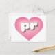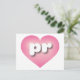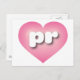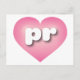 Cette carte postale présente un coeur rose avec un centre blanc contenant des lettres coques inférieures pleines d'audace et arrondies pr, une version ludique de l'abréviation pour Porto Rico, l'île enchantée. Le verso de la carte postale est vide, en attendant vos sentiments manuscrits ou le texte personnalisé.