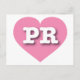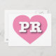 Cette carte postale présente un coeur rose cool et calme contenant les lettres coques en haut, blanches et audacieuses PR, l'abréviation officielle de Porto Rico, l'île enchantée. Le verso de la carte postale est vide, en attendant votre texte customisé ou vos sentiments manuscrits.