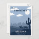 N'importe qui aimerait recevoir cette carte postale d'affiche de voyage vintage avec une illustration rétro, bleue d'un cactus, le désert, les montagnes, et l'horizon de la ville de Phoenix, Arizona!