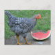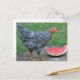 Cette carte postale présente Janet la poule qui adore la pastèque !