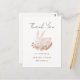 Jolie carte de remerciement pour le premier anniversaire avec une aquarelle douce d'un lapin endormi sur un lit de fleurs et de feuilles bohème. Sur le devant, une belle écriture calligraphique de remerciement, et au dos, un message de remerciement personnalisable avec l'adresse de retour. Cette carte peut être personnalisée pour n'importe quel âge d'enfant !