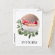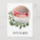 Design minimaliste de carte postale bébé de Noël avec une police moderne pour "Joy to the world" La belle bague en or est délicatement décorée de feuilles verts et de fleurs blanches. Personnalisez les noms, salutation, détails de naissance, adresse et photo avec votre propre nom. Un merveilleux bébé de Noël.