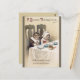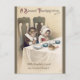 La carte postale présente une illustration de style vintage du début des années 1900 par Ellen Clapsaddle qui représente 2 jeunes enfants pèlerins assis à une table de Thanksgiving pittoresque avec les mains jointes en prière. La légende indique « A Blessed Thanksgiving » et les mots « With thankful and contented heart » en dessous.