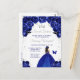 Cette invitation d'anniversaire élégante et glamour pour les seize ans présente une belle princesse à la peau foncée dans une robe de bal bleu foncé. Le texte combine une écriture manuscrite et des polices modernes sans empattement pour un look classe et sophistiqué. Les arrangements floraux, le papillon et les confettis argentés créent le mélange parfait de rustique et de chic.