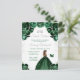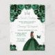 Cette invitation d'anniversaire sweet sixteen élégante et glamour présente une belle princesse avec des cheveux bruns dans une robe de bal vert foncé. Le texte combine une écriture manuscrite et des polices modernes sans serif pour un look classe et sophistiqué. Les arrangements floraux, le papillon et les confettis argentés créent le mélange parfait de rustique et de chic.