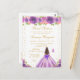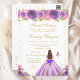 Cette invitation d'anniversaire sweet sixteen élégante et glamour présente une belle princesse aux cheveux bruns et à la peau claire dans une robe de bal violette. Le texte combine une écriture manuscrite et des polices modernes sans serif pour un look classe et sophistiqué. Les arrangements floraux, les papillons et les confettis dorés créent le mélange parfait de rustique et de chic.