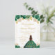 Cette invitation d'anniversaire élégante et glamour pour une Quinceañera représente une belle princesse aux cheveux foncés portant un diadème et une robe de bal verte. Le texte combine une écriture manuscrite et des polices sans empattement modernes pour un rendu chic et sophistiqué. Les arrangements floraux et les confettis dorés créent le mélange parfait entre rustique et chic.