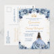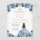 Cette invitation d'anniversaire de Quinceañera élégante et glamour présente une belle princesse aux cheveux noirs dans une robe de bal bleue poussiéreuse. Le texte combine une écriture manuscrite et des polices modernes sans serif pour un look classe et sophistiqué. Les arrangements floraux et les confettis dorés créent le mélange parfait de rustique et de chic.