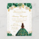 Cette invitation d'anniversaire pour Quinceañera élégante et glamour présente une belle princesse aux cheveux foncés avec un diadème et une robe de bal verte. Le texte combine une écriture manuscrite et des polices sans serif modernes pour un look classe et sophistiqué. Les arrangements floraux et les confettis dorés créent le mélange parfait de rustique et de chic.