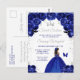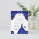 Cette invitation d'anniversaire élégante et glamour pour un sweet sixteen présente une belle princesse à la peau foncée dans une robe de bal bleu foncé. Le texte combine une écriture manuscrite et des polices modernes sans serif pour un look classe et sophistiqué. Les arrangements floraux, le papillon et les confettis argentés créent le mélange parfait de rustique et de chic.