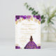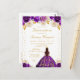 Cette carte de vœux d'anniversaire Quinceañera élégante et glamour représente une belle princesse aux cheveux noirs portant un diadème et une robe de bal violette. Le texte combine une écriture manuscrite et des polices modernes sans serif pour un look classe et sophistiqué. Les arrangements floraux et les confettis dorés créent le mélange parfait de rustique et de chic.