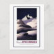 carte postale avec une annonce de voyage poster vintage pour l'Autriche. Illustration paysagère de collines et de montagnes enneigées avec un cabine isolé.