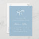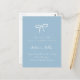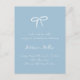 Simple et douce, cette invitation à la douche nuptiale "quelque chose de bleu" comprend des polices de style manuscrit et un graphisme d'arc délicat pour célébrer la mariée à être dans le style tendance et moderne. Le format de carte postale économique facilite l'hébergement sur le porte-monnaie lorsque les mariages peuvent se retrouver à un prix si élevé pour les demoiselles d'honneur et les membres de la famille.