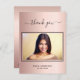 Une carte postale de Merci de Quinceañera (ou de tout âge), élégante et moderne, personnalisée avec votre propre photo. Ajoutez Votre propre photo, votre nom, une date et la note de remerciement. Un arrière - plan à l'apparence métallique, rose, faux . Le texte : Merci sur l'avant et vos noms sur l'arrière sont écrits avec une écriture manuscrite stylisée.