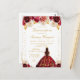 Cette invitation d'anniversaire de Quinceañera élégante et glamour présente une belle princesse aux cheveux foncés avec un diadème et une robe de bal rouge. Le texte combine une écriture manuscrite et des polices modernes sans serif pour un look classe et sophistiqué. Les arrangements floraux et les confettis dorés créent le mélange parfait de rustique et de chic.
