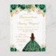 Cette carte d'anniversaire Quinceañera élégante et glamour présente une belle princesse aux cheveux foncés avec un diadème et une robe de bal verte. Le texte combine une écriture manuscrite et des polices modernes sans serif pour un look classe et sophistiqué. Les arrangements floraux et les confettis dorés créent le mélange parfait de rustique et de chic.
