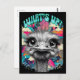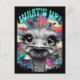 Un autruche aux traits exagérés est représenté contre un arrière - plan vibrant et coloré, avec l'expression "QUOI DE PLUS ?" en caractères gras au-dessus de la tête. L'oeuvre combine des éléments de style fantaisie et pop art, créant ainsi une exposition attrayante.