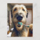 Un Wolfhound irlandais à la fourrure de shaggy tient une brosse à dents dans sa patte tout en se tenant dans une salle de bain Le texte peut être changé.