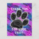 Que vous soyez un cabinet vétérinaire, un toiletteur ou un promeneur de chiens, faites la promotion de votre entreprise avec une carte postale peu coûteuse. Cette carte postale d'appréciation des clients présente une grande empreinte de patte noire sur un fond rayé en diagonale de bleu et de violet. "Merci de votre confiance" peut être personnalisé rapidement et facilement si vous le souhaitez.